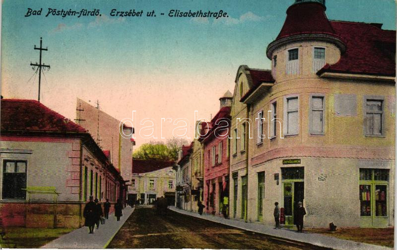 Beschreibung: Pöstyénfürdő, Erzsébet út, Justh Salamon kereskedése; kiadja Donáth Lipót versenyáruháza / Elisabethstrasse / Elisabeth street