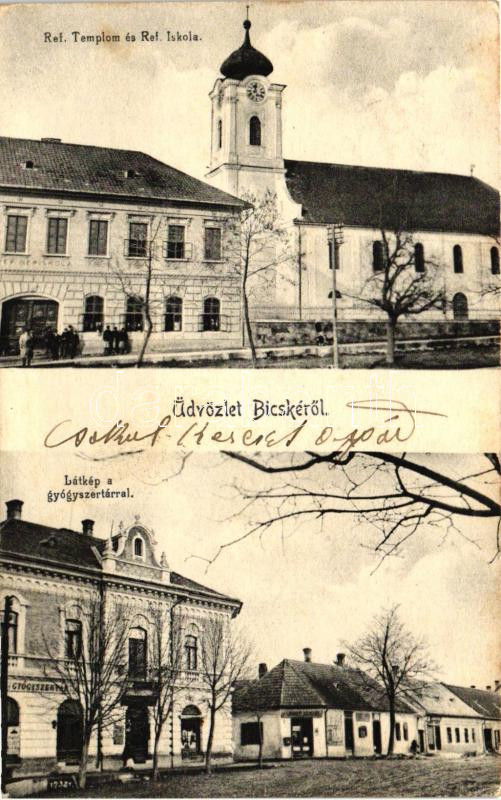 Bicske, református templom és iskola, gyógyszertár, L. Nándor üzlete, ... https://www.darabanth.com/de/234-Fernauktion/234.0/Ansichtskarten/Ungarn~5/Bicske-reformatus-templom-es-iskola-gyogyszertar-L-Nandor-uzlete-Wokaun-Jozsef-felvetel~II1070795