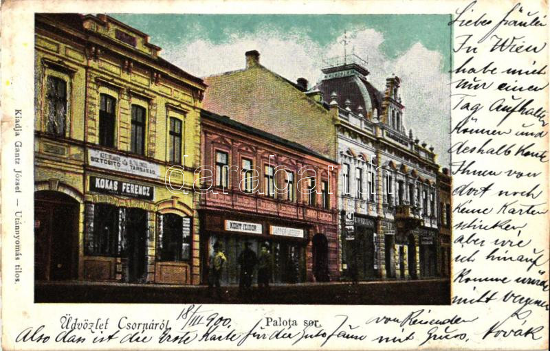 Beschreibung: Csorna, Biztosító Társaság, Kokas Ferenc és Koht Izidor üzletei, kiadja Gantz József (kis szakadás / small tear)