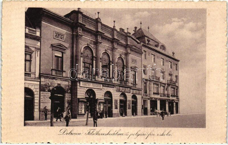 Beschreibung: Debrecen, Felsőkereskedelmi polgári fiúiskola, Csáthy Ferenc és Balla Lajos üzletei ; Csáthy Ferencz kiadása