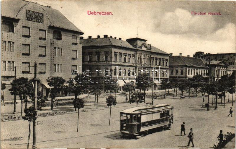 Debrecen, Fő utca, Alföldi Takarékpénztár, villamos https://www.darabanth.com/de/234-Fernauktion/234.0/Ansichtskarten/Ungarn~5/Debrecen-Fo-utca-Alfoldi-Takarekpenztar-villamos~II1069614