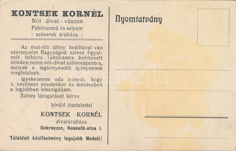 Beschreibung: Debrecen, Kontsek Kornél Női divat-vászon, fehérnemű és selyem szövetek áruházának művészi reklám képeslapja; Kossuth utca 1. (fl)