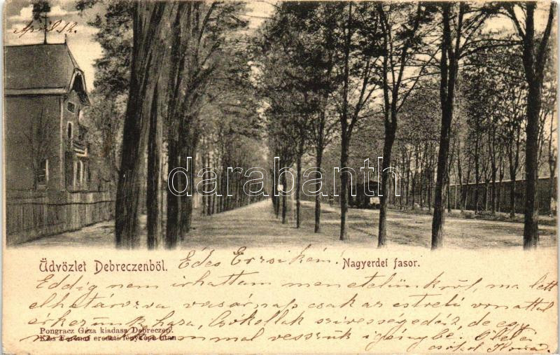 Debrecen, Nagyerdei fasor, villamos; Pongrácz Géza kiadása https://www.darabanth.com/de/234-Fernauktion/234.0/Ansichtskarten/Ungarn~5/Debrecen-Nagyerdei-fasor-villamos-Pongracz-Geza-kiadasa~II1069609