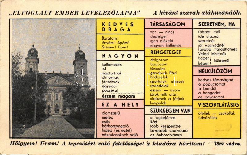 Beschreibung: Debrecen, Református nagytemplom, Elfoglalt ember levelezőlapja, humor