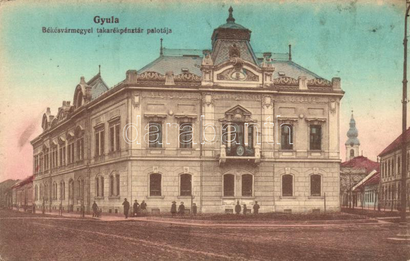 Gyula, Békésvármegyei takarékpénztár palotája, Dobay János kiadása https://www.darabanth.com/de/234-Fernauktion/234.0/Ansichtskarten/Ungarn~5/Gyula-Bekesvarmegyei-takarekpenztar-palotaja-Dobay-Janos-kiadasa~II1064145