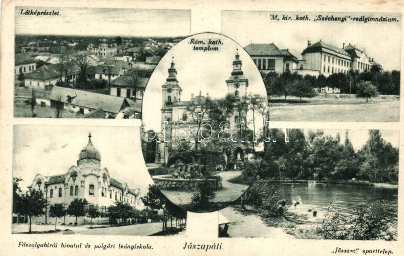 Beschreibung: Jászapáti, Katolikus Széchenyi reálgimnázium, Jössz-e sporttelep, Főszolgabírói hivatal, Polgári leányiskola (EK)