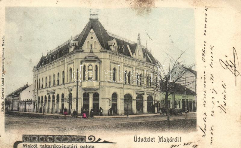 Beschreibung: Makó, Takarékpénztári palota, üzletek, gyógyszertár, kiadja Kovács Antal (EK)