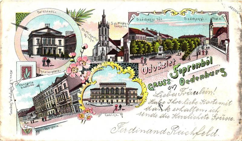 Beschreibung: Sopron, Színház tér, Szent Mihály templom, Széchenyi tér, pannónia szálloda, Casino, Art Nouveau, floral, litho (small tear)