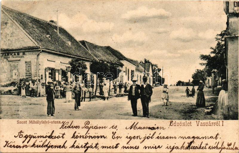 Vasvár, Szent Mihály utca, Farkas S. kereskedése (r) https://www.darabanth.com/de/234-Fernauktion/234.0/Ansichtskarten/Ungarn~5/Vasvar-Szent-Mihaly-utca-Farkas-S-kereskedese-r~II1065082