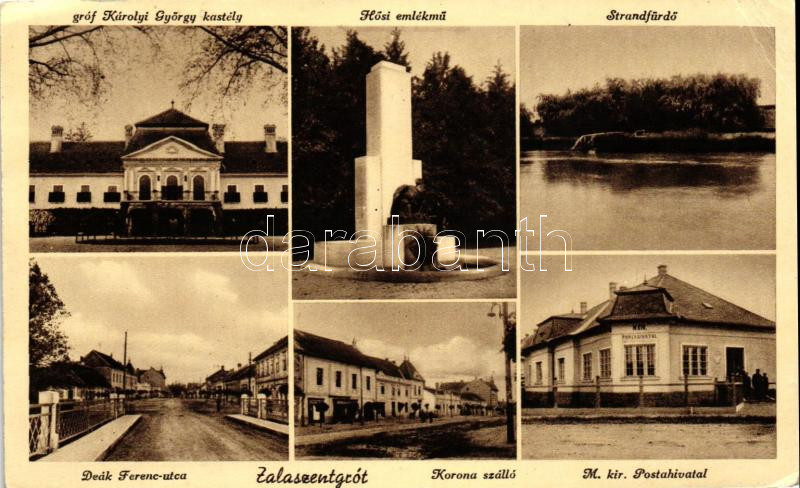 Beschreibung: Zalaszentgrót, Deák Ferenc utca, Postahivatal, Korona szálló, gróf Károlyi György kastély, Hősi emlékmű, Zacsik Károly kiadása (ázott / sarok / wet corner)