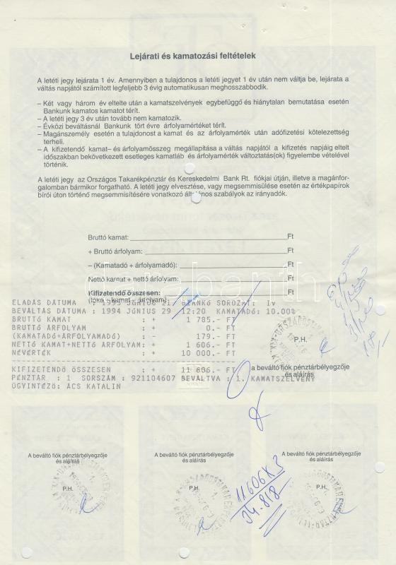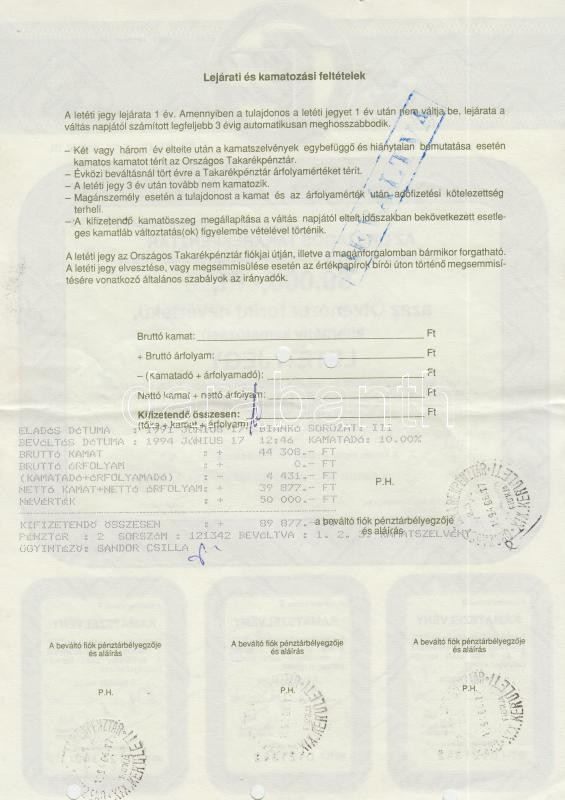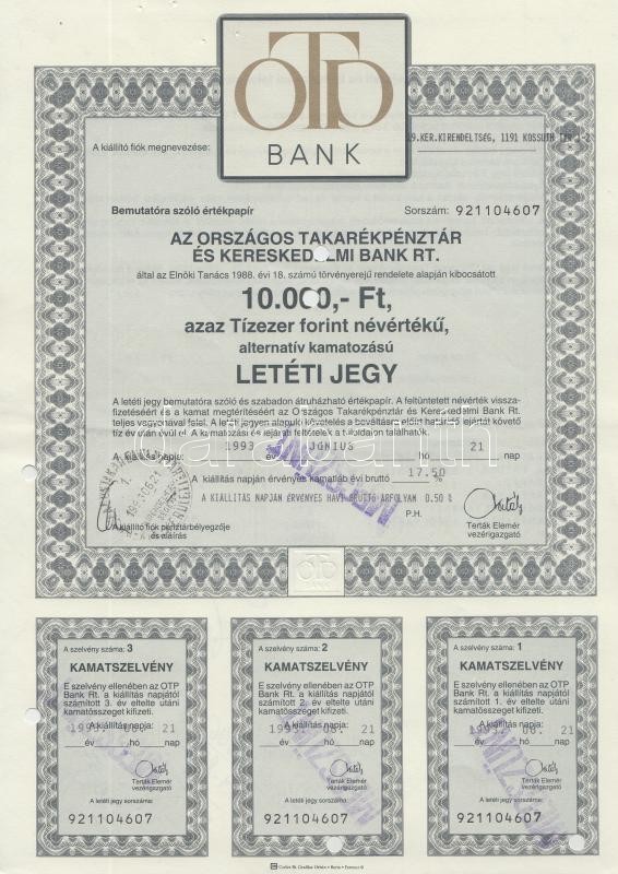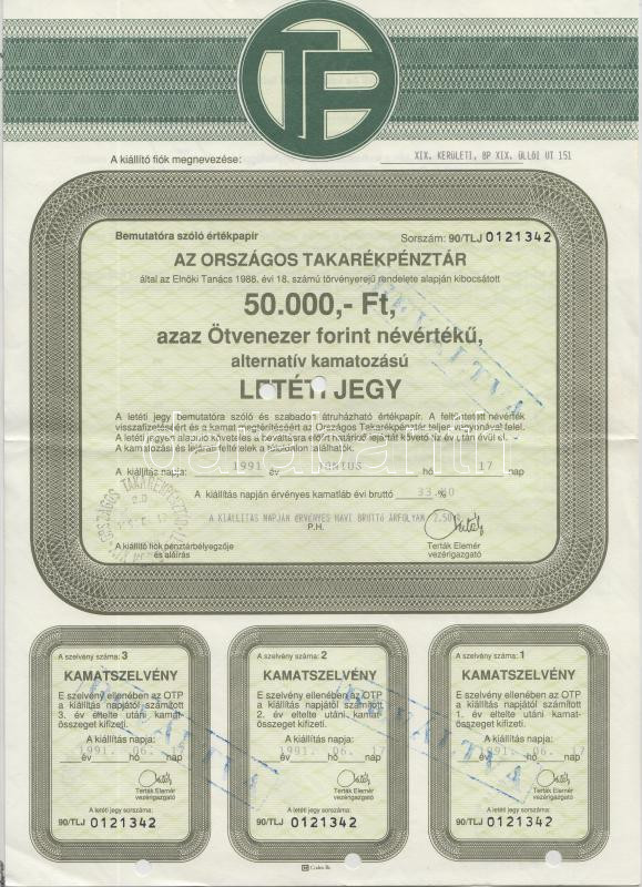 Budapest 1991. "OTP Bank" letéti jegye 50.000Ft-ról, szelvényekkel, bé... https://www.darabanth.com/de/234-Fernauktion/234.0/Numismatik/Aktien-und-Tickets~30005/Budapest-1991-OTP-Bank-leteti-jegye-50000Ft-rol-szelvenyekkel-belyegzesekkel-lyukasztas~II1065990
