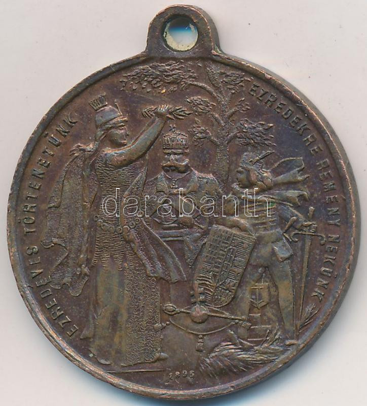 Beschreibung: Steiner Ármin (éremüzem, 19. század) 1896. "Ezredéves Történetünk Ezredekre Remény Nekünk - Honfoglalás" millenniumi Br emlékérem füllel (32,5mm) T:2-