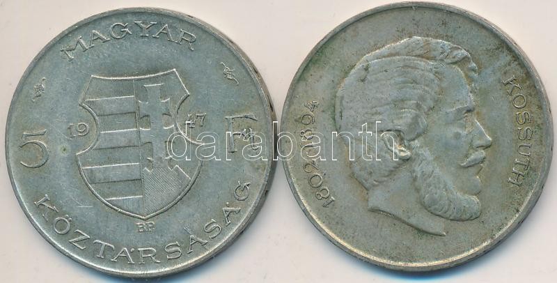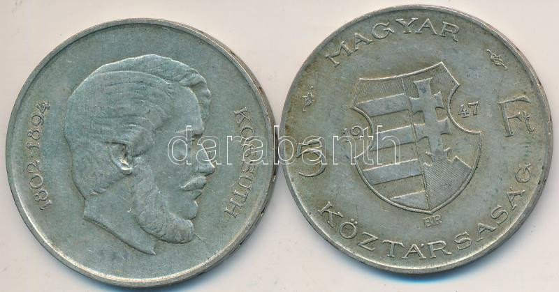 1947. 5Ft Ag "Kossuth" (2x) T:2-,3 https://www.darabanth.com/de/234-Fernauktion/234.0/Numismatik/Ungarische-Munzen~30008/1947-5Ft-Ag-Kossuth-2x-T2-3~II1066890