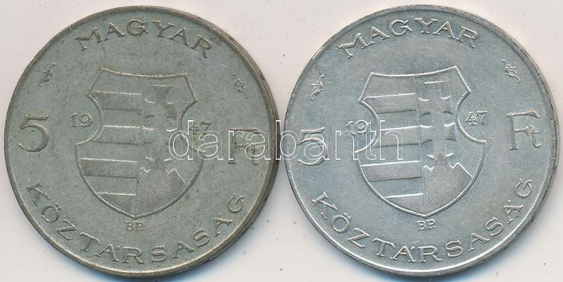 1947. 5Ft Ag "Kossuth" (2x) T:2-,3 https://www.darabanth.com/de/234-Fernauktion/234.0/Numismatik/Ungarische-Munzen~30008/1947-5Ft-Ag-Kossuth-2x-T2-3~II1069913