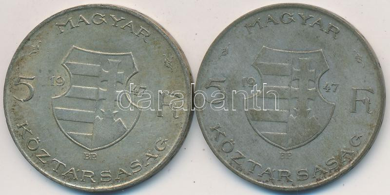 1947. 5Ft Ag "Kossuth" (2x) T:2-,3 https://www.darabanth.com/de/234-Fernauktion/234.0/Numismatik/Ungarische-Munzen~30008/1947-5Ft-Ag-Kossuth-2x-T2-3~II1069915