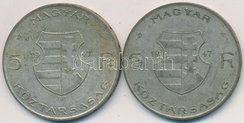 1947. 5Ft Ag "Kossuth" (2x) T:2-,3 https://www.darabanth.com/de/234-Fernauktion/234.0/Numismatik/Ungarische-Munzen~30008/1947-5Ft-Ag-Kossuth-2x-T2-3~II1069917