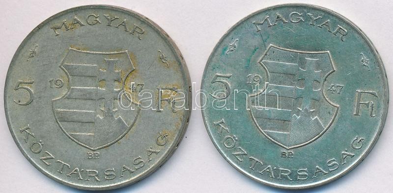 1947. 5Ft Ag "Kossuth" (2x) T:2- https://www.darabanth.com/de/234-Fernauktion/234.0/Numismatik/Ungarische-Munzen~30008/1947-5Ft-Ag-Kossuth-2x-T2-~II1066826