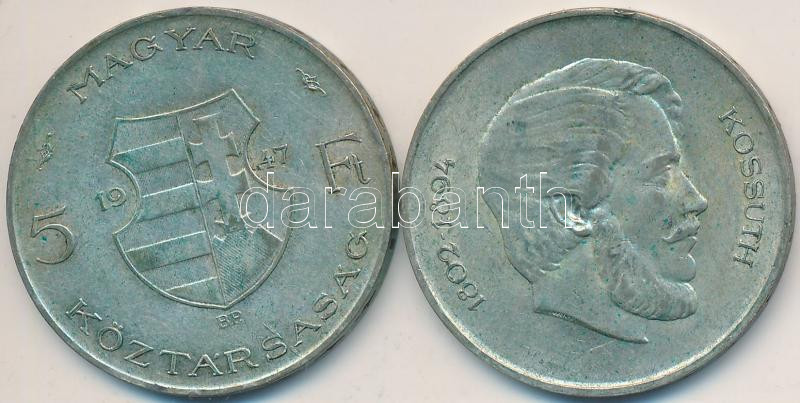 1947. 5Ft Ag "Kossuth" (2x) T:2- https://www.darabanth.com/de/234-Fernauktion/234.0/Numismatik/Ungarische-Munzen~30008/1947-5Ft-Ag-Kossuth-2x-T2-~II1066957