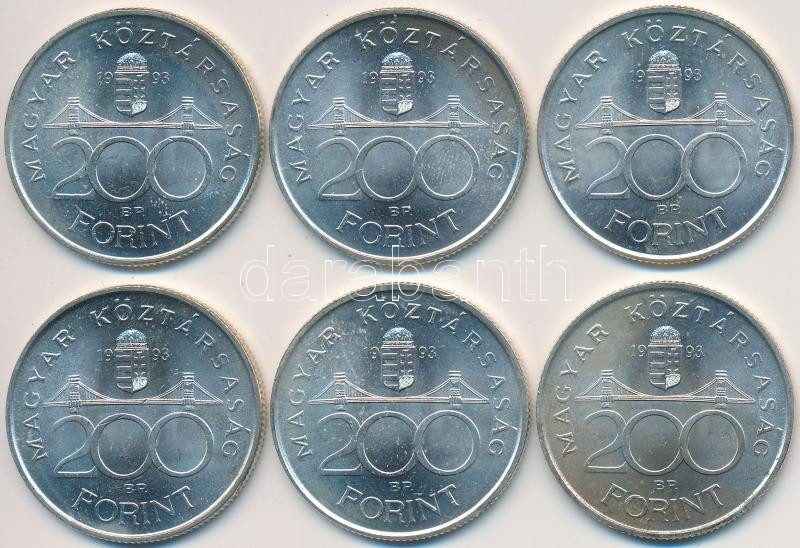 1993. 200Ft Ag "MNB" (6x) T:2 https://www.darabanth.com/de/234-Fernauktion/234.0/Numismatik/Ungarische-Munzen~30008/1993-200Ft-Ag-MNB-6x-T2~II1065658
