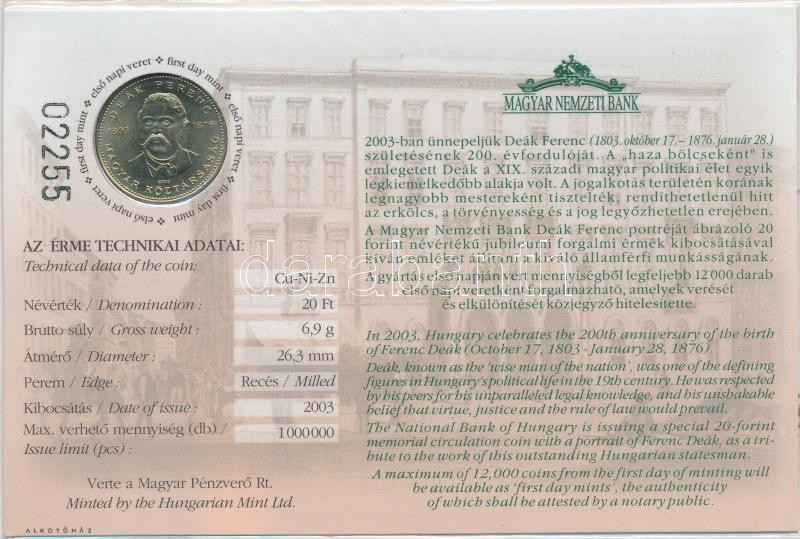 Beschreibung: 2003. 20Ft "Deák Ferenc" elsőnapi veret számozott emléklapon T:BU