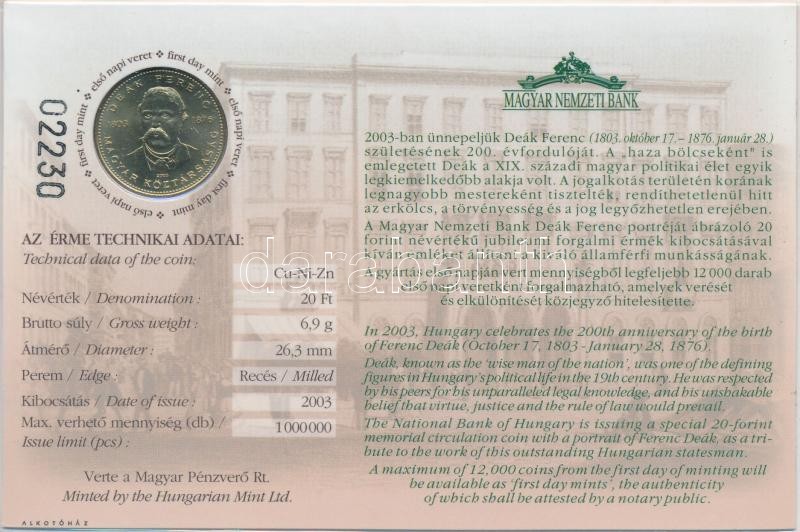 Beschreibung: 2003. 20Ft "Deák Ferenc" elsőnapi veret számozott emléklapon T:BU