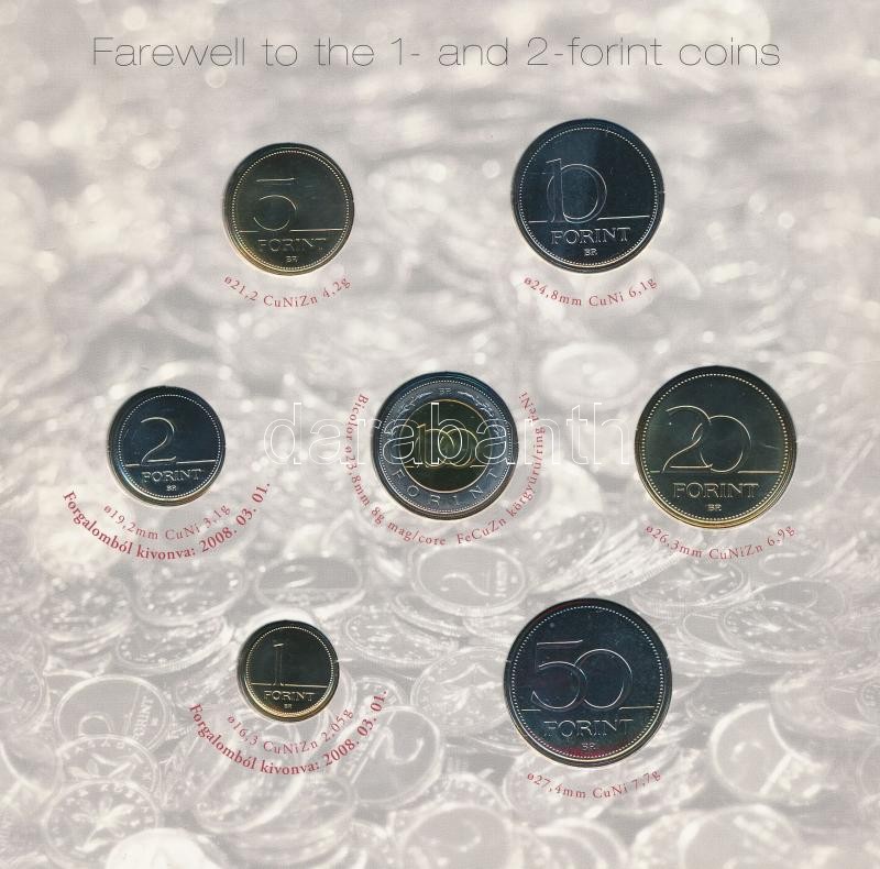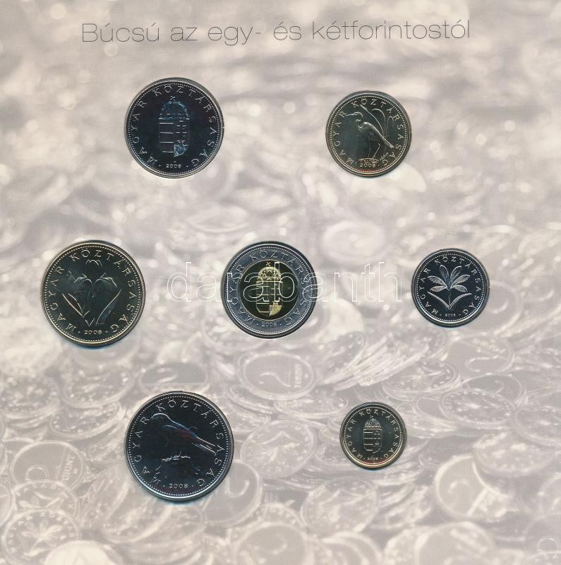 2008. 1Ft-100Ft "Búcsú az egy- és kétforintostól" 7xklf db dísztokos s... https://www.darabanth.com/de/234-Fernauktion/234.0/Numismatik/Ungarische-Munzen~30008/2008-1Ft-100Ft-Bucsu-az-egy-es-ketforintostol-7xklf-db-disztokos-szettben-TBU~II1068514