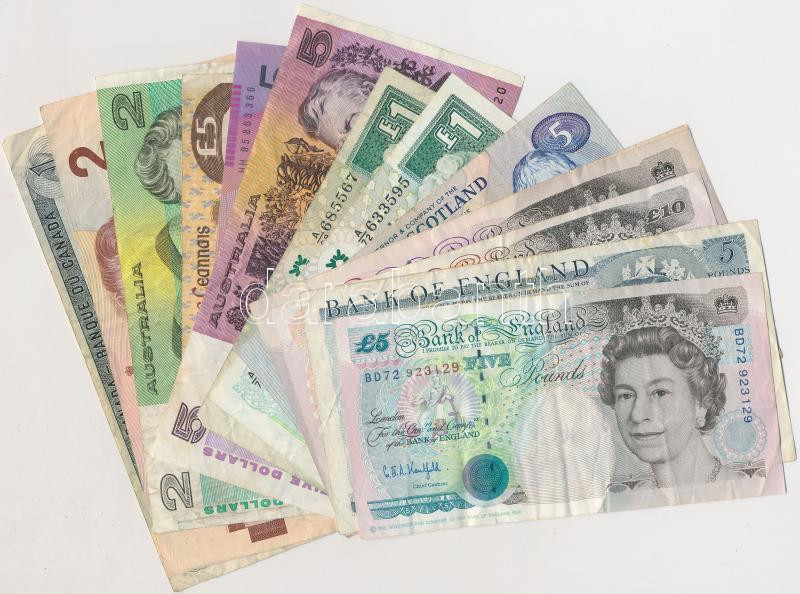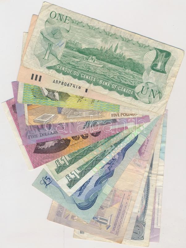 13db-os vegyes modern külföldi bankjegy tétel, közte Kanada (2db), Ausztrália (3db), Írország (1db), Skócia (3db), Nagy-Britannia (4db) T:vegyes