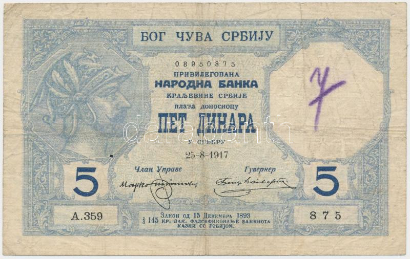 Serbia 1917. 5 Dinara C:VG needle hole https://www.darabanth.com/de/234-Fernauktion/234.0/Numismatik/Weltweit-Banknoten~30011/Szerbia-1917-5D-TIII-tulyuk-3Cbr3ESerbia-1917-5-Dinara-CVG-needle-hole~II1069766