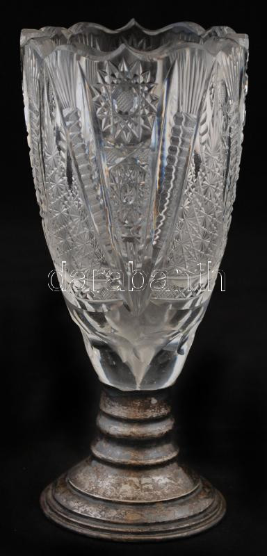 Beschreibung: Ezüst (Ag.) talpú ólomkristály váza, csiszolt, metszett, jelzett, hibátlan, m: 20 cm