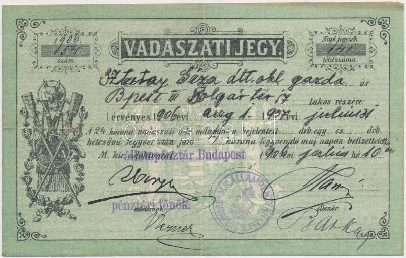 1906 Hunter licence https://www.darabanth.com/de/235-Fernauktion/235.0/Andere-Sammelgebiete/Dokument~400032/1906-Vadaszjegy--3Cbr3E1906-Hunter-licence~II1075185