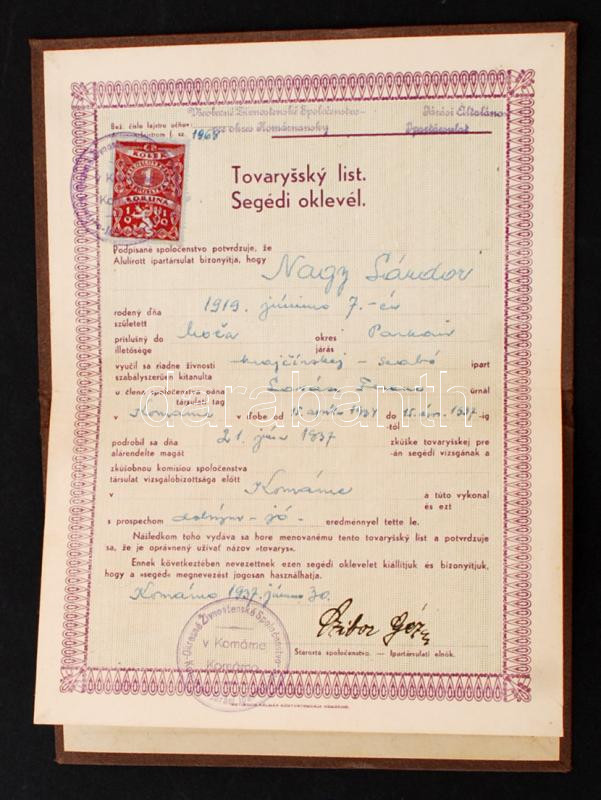 1937 Komárom, Szabóinasnak a járási általános ipartestület által kiáll... https://www.darabanth.com/de/235-Fernauktion/235.0/Andere-Sammelgebiete/Dokument~400032/1937-Komarom-Szaboinasnak-a-jarasi-altalanos-ipartestulet-altal-kiallitott-segedi-oklevC3~II1074386