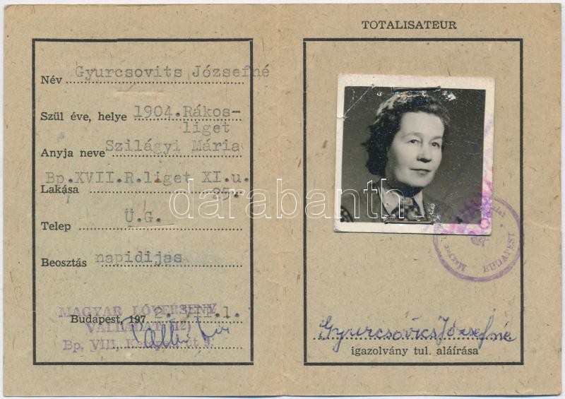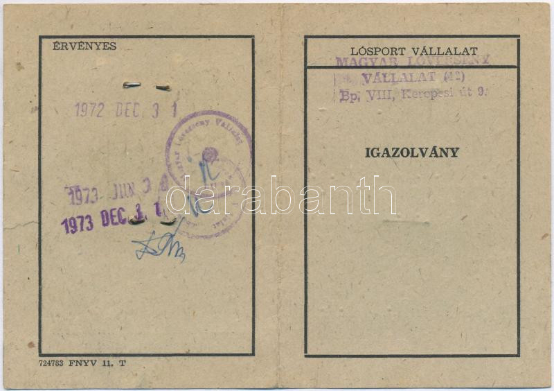 1972 Magyar Lovaregylet, fényképes totalisateur igazolvány https://www.darabanth.com/de/235-Fernauktion/235.0/Andere-Sammelgebiete/Dokument~400032/1972-Magyar-Lovaregylet-fenykepes-totalisateur-igazolvany~II1077583