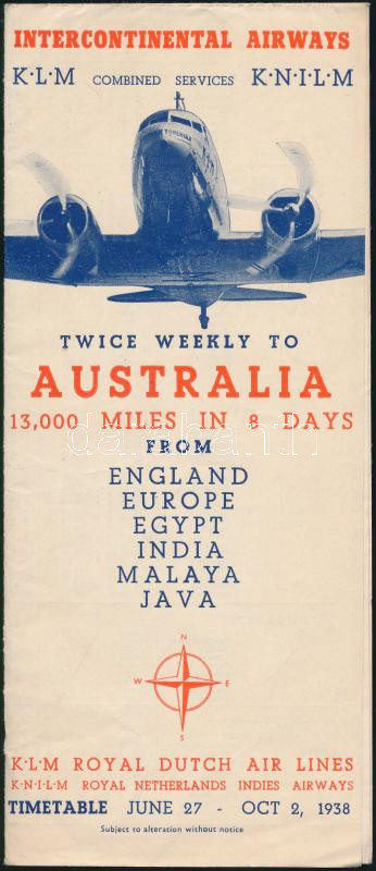 1938 A K.L.M. holland királyi légitársaság Ausztráliába tartó járatain... https://www.darabanth.com/de/235-Fernauktion/235.0/Andere-Sammelgebiete/Drucksachen~400004/1938-A-KLM-holland-kiralyi-legitarsasag-Ausztraliaba-tarto-jaratainak-listaja-menetrendj~II1077803