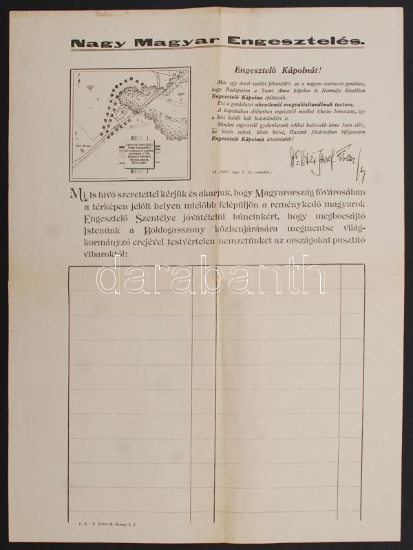 cca 1943 Nagy Magyar Engesztelés, aláírást gyűjtőív Engesztelő Kápolna... https://www.darabanth.com/de/235-Fernauktion/235.0/Andere-Sammelgebiete/Drucksachen~400004/cca-1943-Nagy-Magyar-Engeszteles-alairast-gyujtoiv-Engesztelo-Kapolna-epitesehez-3Cbr3E~II1076905