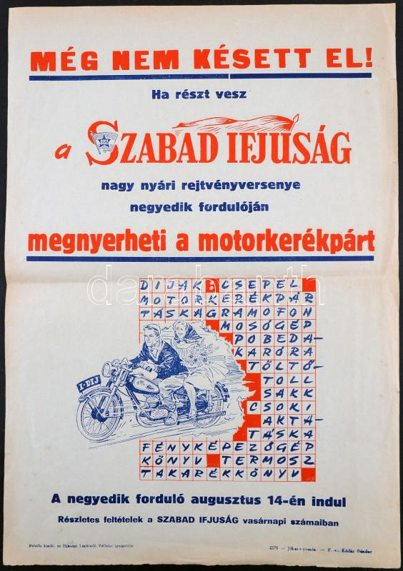 cca 1950 Szabad Ifjúság rejtvényújság reklámplakát Csepel motorkerékpá... https://www.darabanth.com/de/235-Fernauktion/235.0/Andere-Sammelgebiete/Drucksachen~400004/cca-1950-Szabad-Ifjusag-rejtvenyujsag-reklamplakat-Csepel-motorkerekpar-nyeremennyel-40x60~II1076316