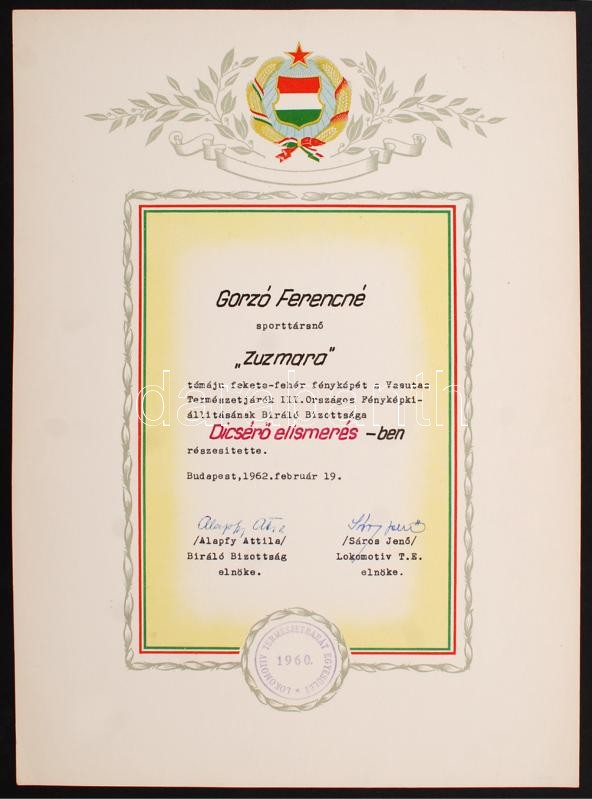 Beschreibung: Gorzó Ferencné:Zúzmara fotó paszpartuban, 23x16cm+ elismerő oklevél