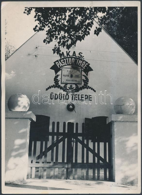 Beschreibung: cca 1950 A Magyar Közlekedési Alkalmazottak Szabad Szakszervezete Pásztor Imréről elnevezett üdülőtelepe, Tiszavölgyi József pecséttel jelzett fotója, 18x13 cm