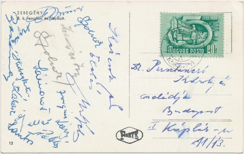 Beschreibung: 1950 Az MTK (Textiles, Vörös Lobogó). azévben bajnok labdarúgó csapat által aláírt levelezőlap (Hidegkúti, Lakatos, Palotás, Szolnok)