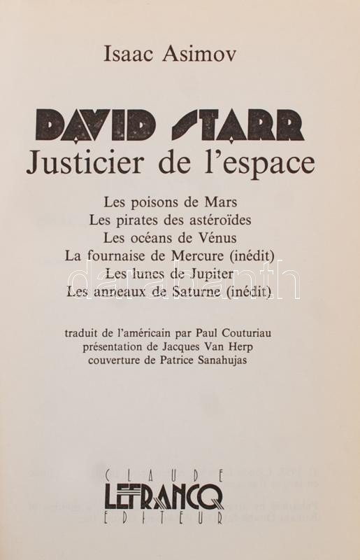 Beschreibung: Asimov, Isaac: David Starr, justicier de l'espace. s. l., 1993, Claude Lefrancq. Papírkötésben, jó állapotban.