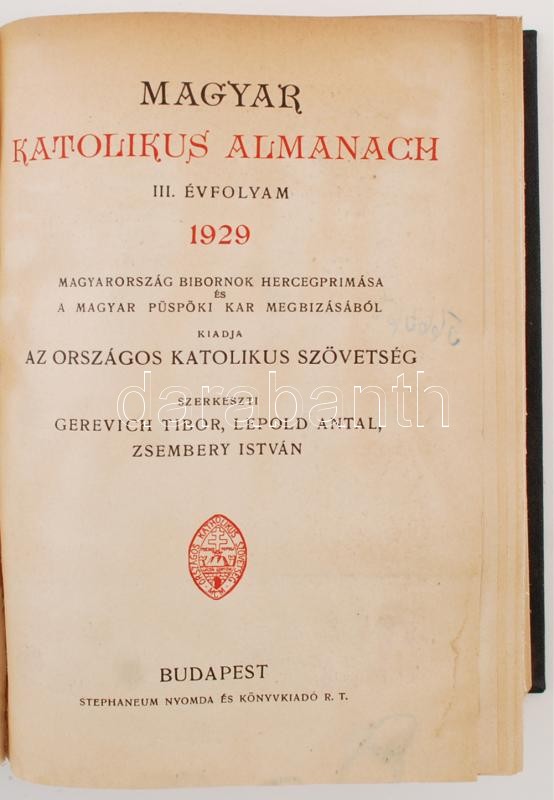 Gerevich Tibor, Lepold Antal, Zsembery István (szerk.): Magyar Katolik... https://www.darabanth.com/de/236-Fernauktion/236.0/Andere-Sammelgebiete/Bucher-Religion~400032/Gerevich-Tibor-Lepold-Antal-Zsembery-Istvan-szerk-Magyar-Katolikus-almanach-III-evfolyam-19~II1049098