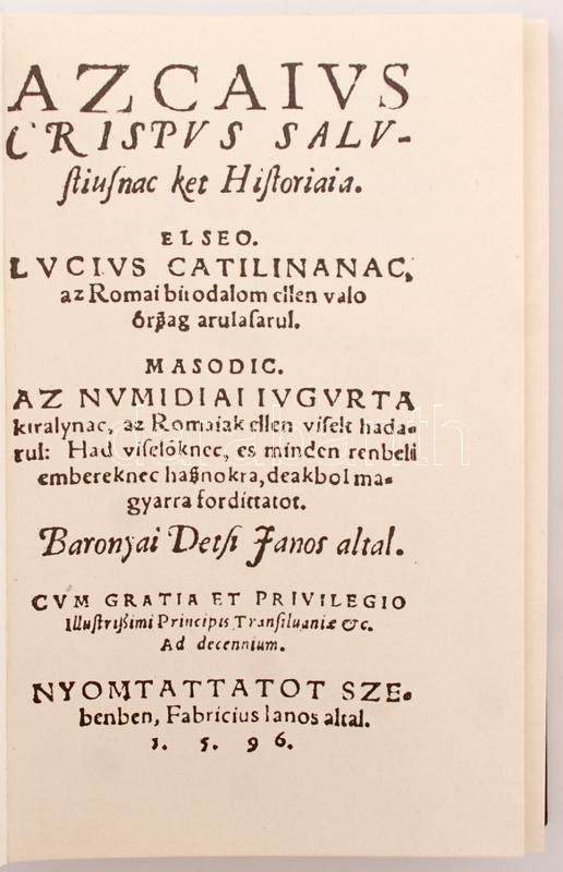 Baranyai Decsi János: Az Caius Crispus Sallustiusnak két históriája. S... https://www.darabanth.com/de/236-Fernauktion/236.0/Andere-Sammelgebiete/Bucher-Sonstige-Raritaten~400040/Baranyai-Decsi-Janos-Az-Caius-Crispus-Sallustiusnak-ket-historiaja-Szeben-1596-Reprint-kiadC3~II1083174