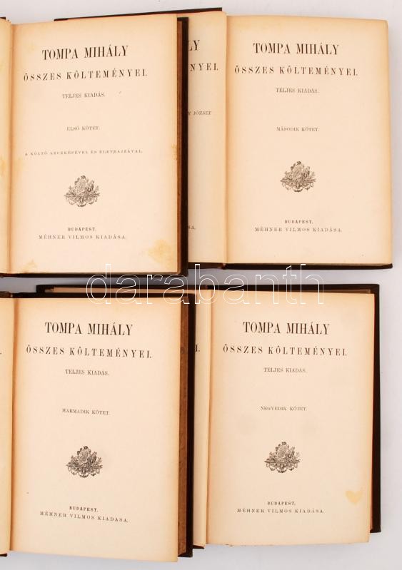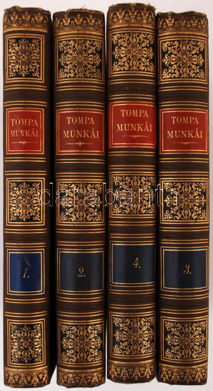 Tompa Mihály összes költeményei I-IV. kötet. Teljes kiadás. Magyar remekírók sorozat. Bp., 1870, Méhner Vilmos kiadása. Kiadói aranyozott, bordázott gerincű, festett egészvászon kötés, festett lapszélek, néhol a lapok foltosak, jó állapotban.