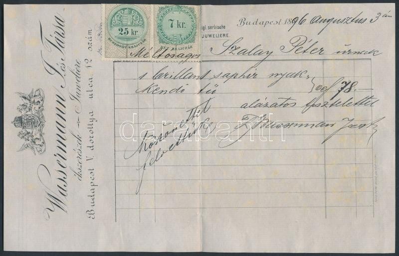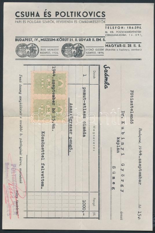 Beschreibung: 1896, 1944 Bp. IV-V., 2 db számla(Wassermann I. és Társa Csuha és Politikovics Papi és Polgári szabók) okmánybélyegekkel