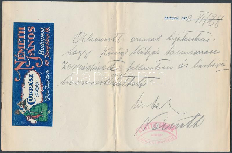 Beschreibung: 1922 Bp.VIII., Németh János Cukrász díszes fejléces levélpapírja, rajta szerződést felbontó szöveggel