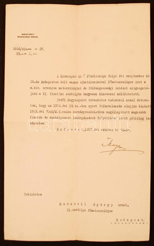 1927 Bp., A Magyar Királyi Földművelésügyi Miniszter által kiadott kinevező okirat az országos meteorológiai és földmágnesességi intézet aligazgatói pozíciójába Mayer János földművelésügyi miniszter aláírásával