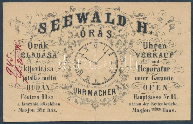 1887 Buda, Seewald H. órás magyar-német nyelvű reklámkártyája, 11x6,5 ... https://www.darabanth.com/de/236-Fernauktion/236.0/Andere-Sammelgebiete/Drucksachen~400007/1887-Buda-Seewald-H-oras-magyar-nemet-nyelvu-reklamkartyaja-11x6-5-cm~II1087378