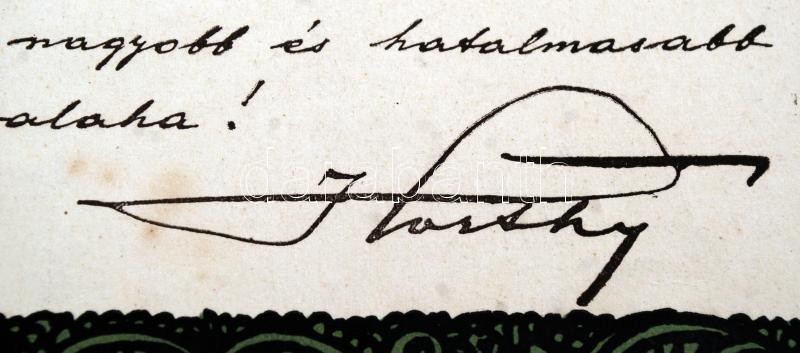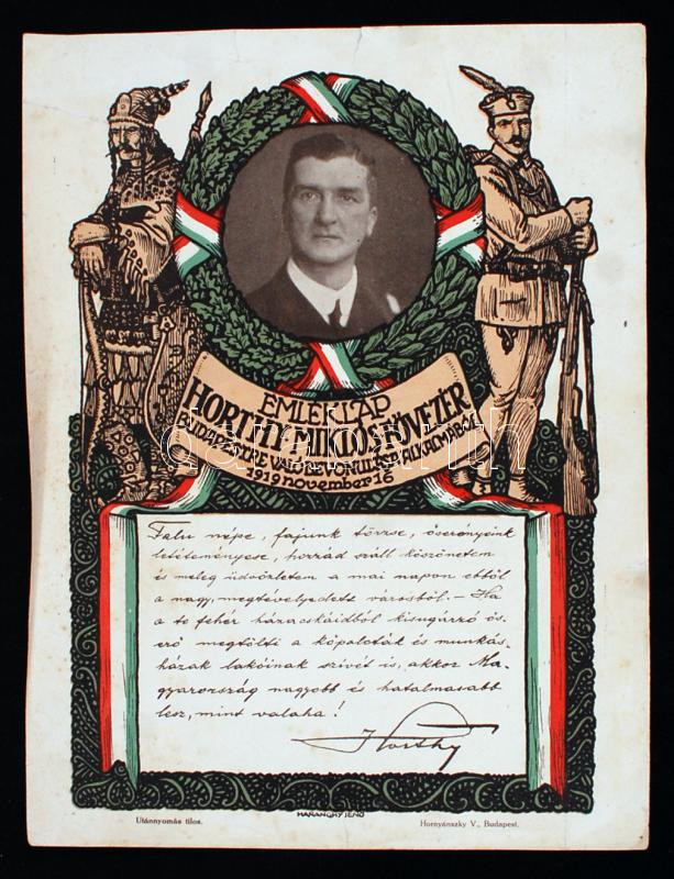 1919 Horthy Miklós kormányzó(1868-1957) Budapestre való bevonulása alkalmából kiadott emléklap, rajta Horthy nyomtatott aláírásával, készült Hornyánszky Jenő nyomdáájában, 32x24 cm