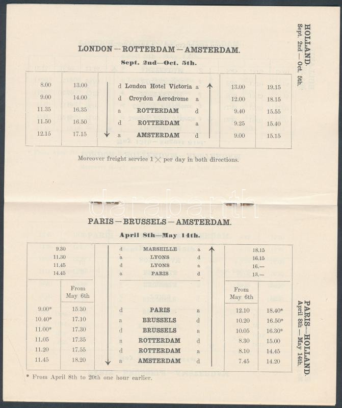 1929 A K.L.M. holland királyi légitársaság nyári menetrendje /
