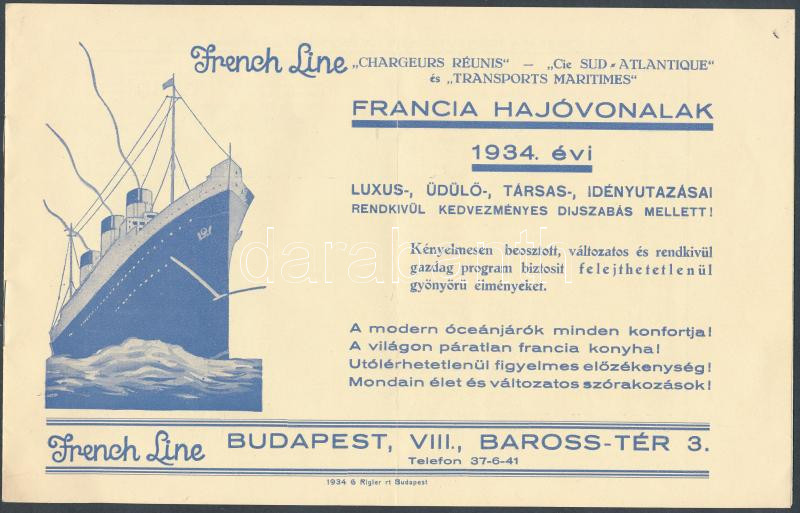 1934 Bp. VIII., "A Francia Hajóvonalak Luxus-, üdülő-, társas-, idényu... https://www.darabanth.com/de/236-Fernauktion/236.0/Andere-Sammelgebiete/Drucksachen~400007/1934-Bp-VIII-A-Francia-Hajovonalak-Luxus--udulo--tarsas--idenyutazasai-rendkivul-ked~II1087557