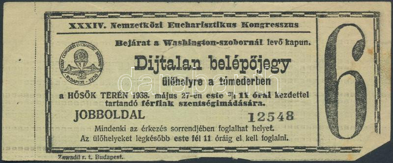 1938 Eucharisztikus Kongresszus belépőjegy a férfiak szentségimádására https://www.darabanth.com/de/236-Fernauktion/236.0/Andere-Sammelgebiete/Drucksachen~400007/1938-Eucharisztikus-Kongresszus-belepojegy-a-ferfiak-szentsegimadasara~II1084138